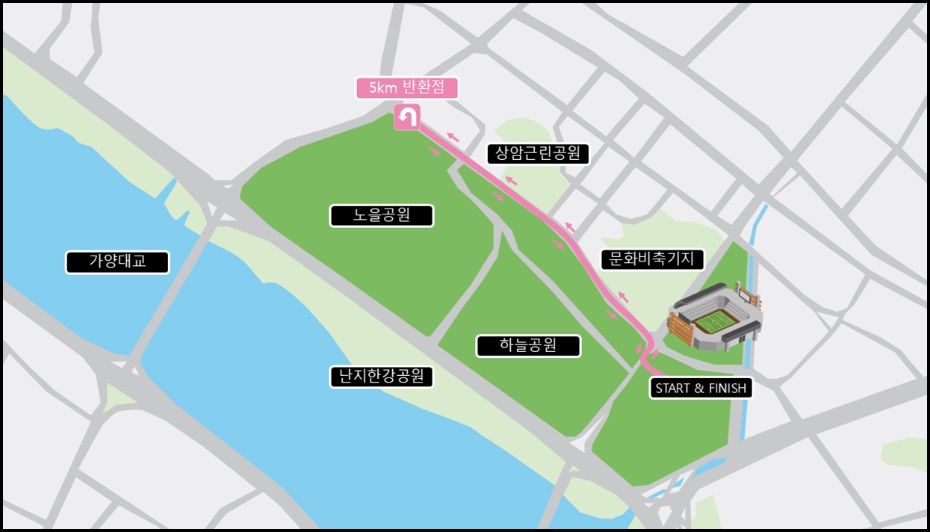 ◆10km : 평화광장(출발) > 경기장 R > 구룡 R > 가양대교 > 가양대교 남단(반환) > 구룡 R > 경기장 R > 평화광장(피니쉬)